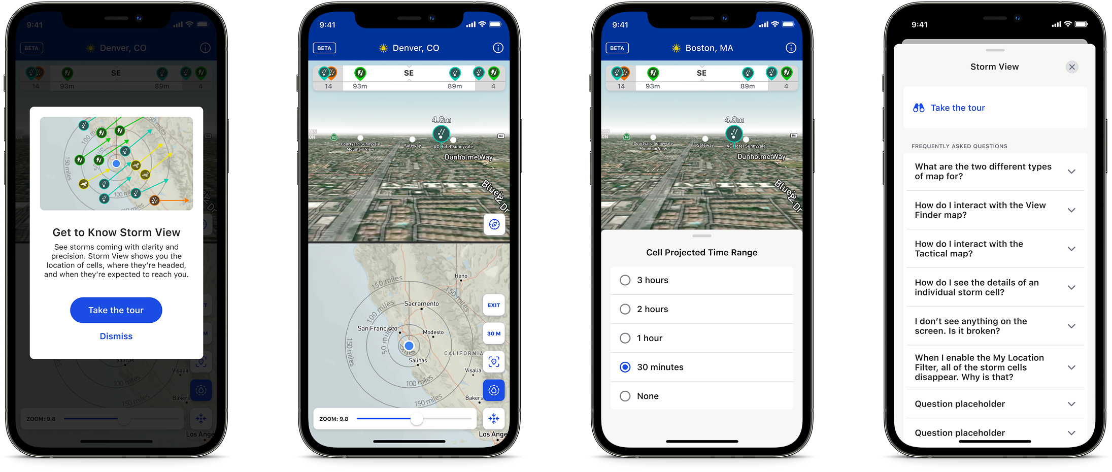 For the main radar screen, I introduced a dark blue top navigation bar to clearly signal that users were in the beta experience. I also added a timeline scrubber, allowing users to animate the map and view forecasted weather.